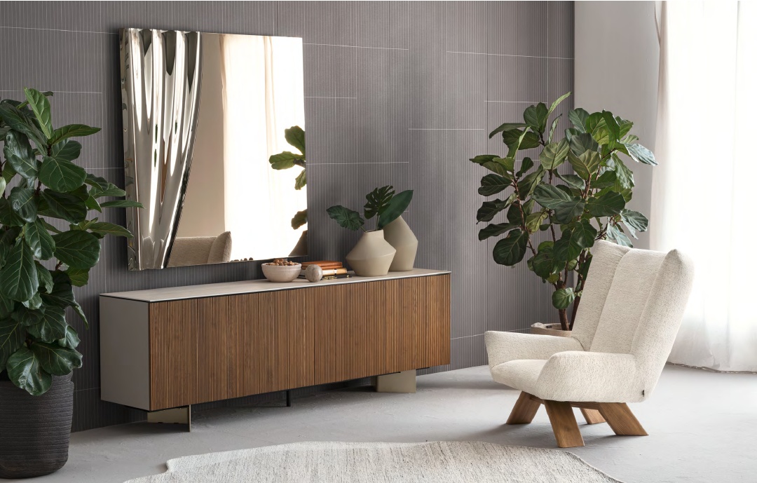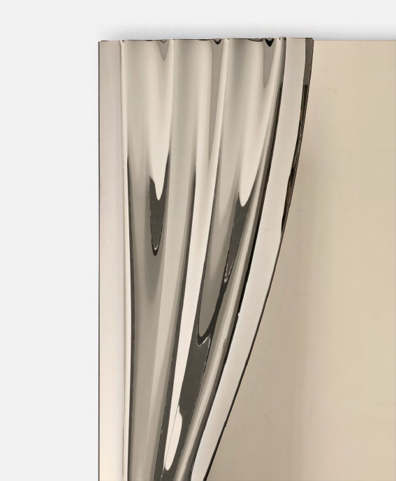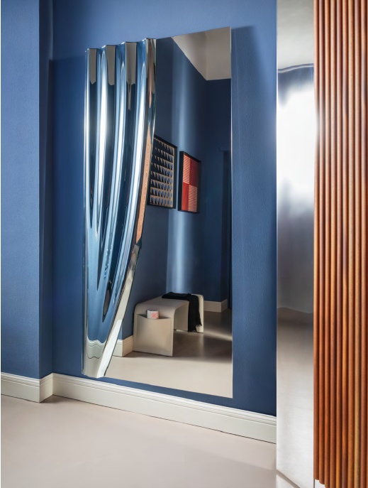 Sipario is a mirror with a poetic design that combines curved glass and flat glass. Simulating the curtain of a theatre, the mirror is characterized by two parts, a reflective one and one that breaks down the image, symbolizing the contrast between what is shown and what remains hidden. Available in 3 colors: Mirror, Bronze Mirror és Grey Mirror