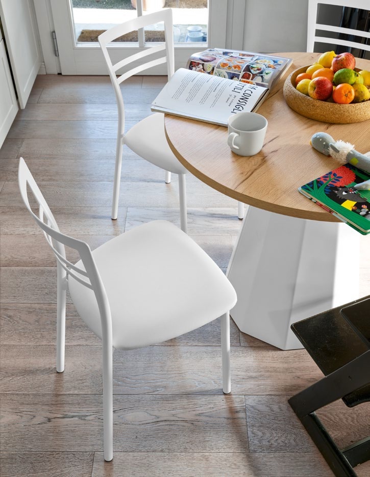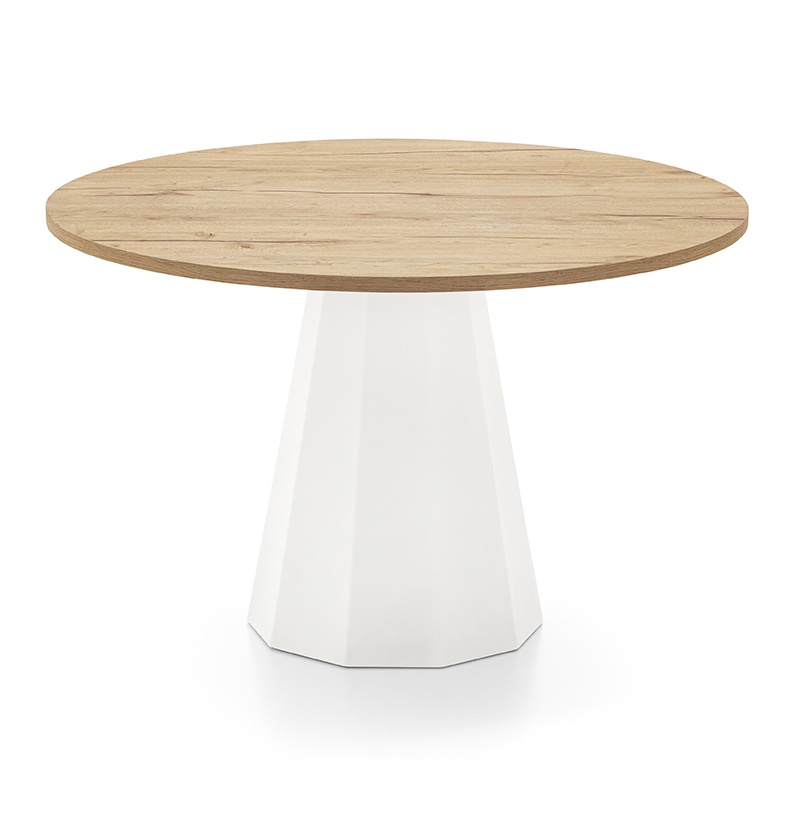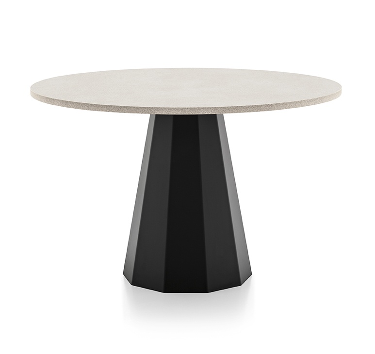 DIX non-extending round table set on a ten-sided conical pedestal base made from coated faceted sheet-metal. Endowed with a levelling foot concealed on the inside, making it suitable for any kind of flooring. Manufacturer: CONNUBIA by CALLIGARIS©