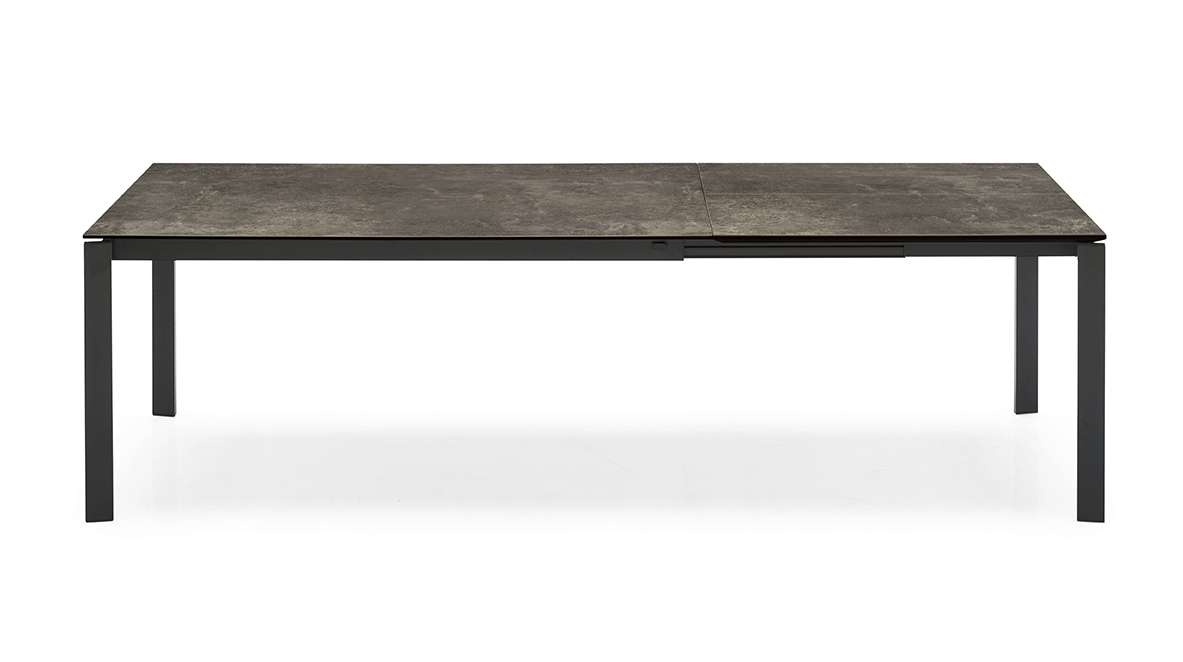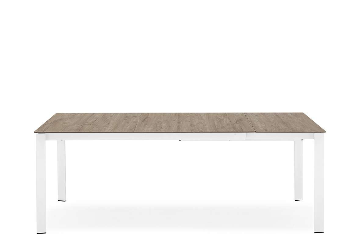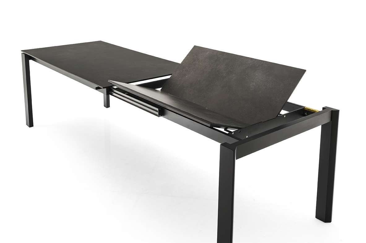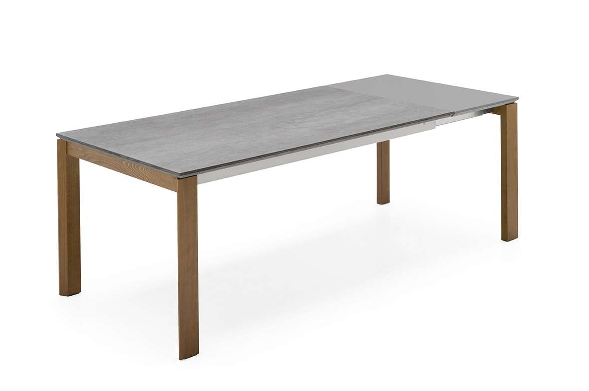 Eminence extendable table in a mix of materials. The single extension leaf is made of laminate, matching the edge of the top, which features a combination of wood and tempered glass or laminated wood. The legs are made of wood or metal. This extensive line of modular tables can adapt to any space and furnishing requirement.
