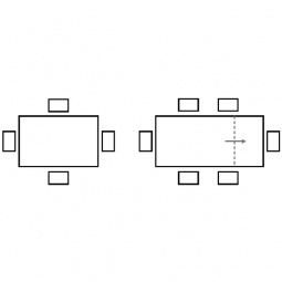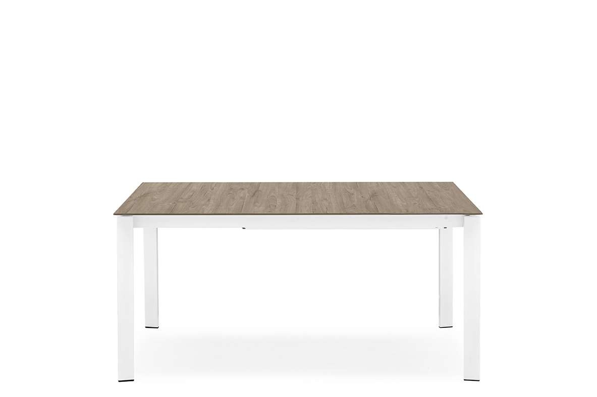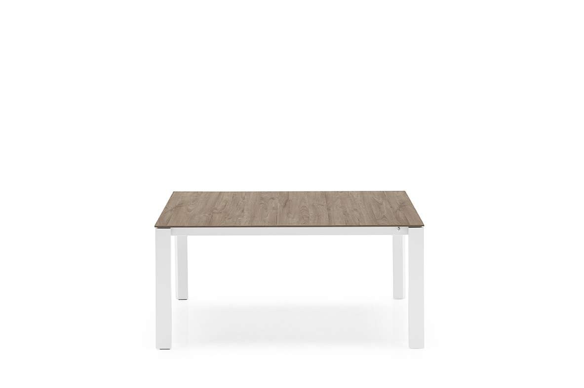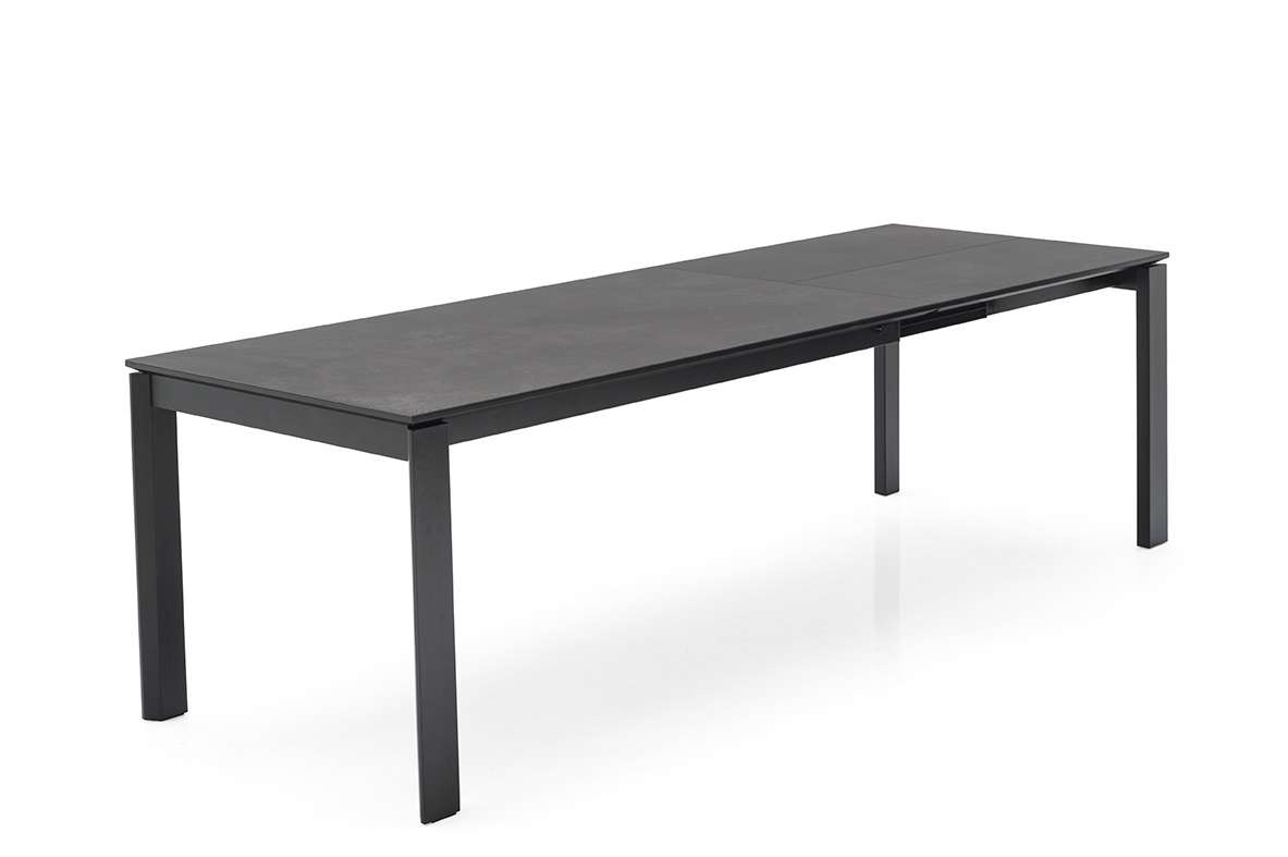 Eminence extendable table in a mix of materials. The single extension leaf is made of laminate, matching the edge of the top, which features a combination of wood and tempered glass or laminated wood. The legs are made of wood or metal. This extensive line of modular tables can adapt to any space and furnishing requirement.