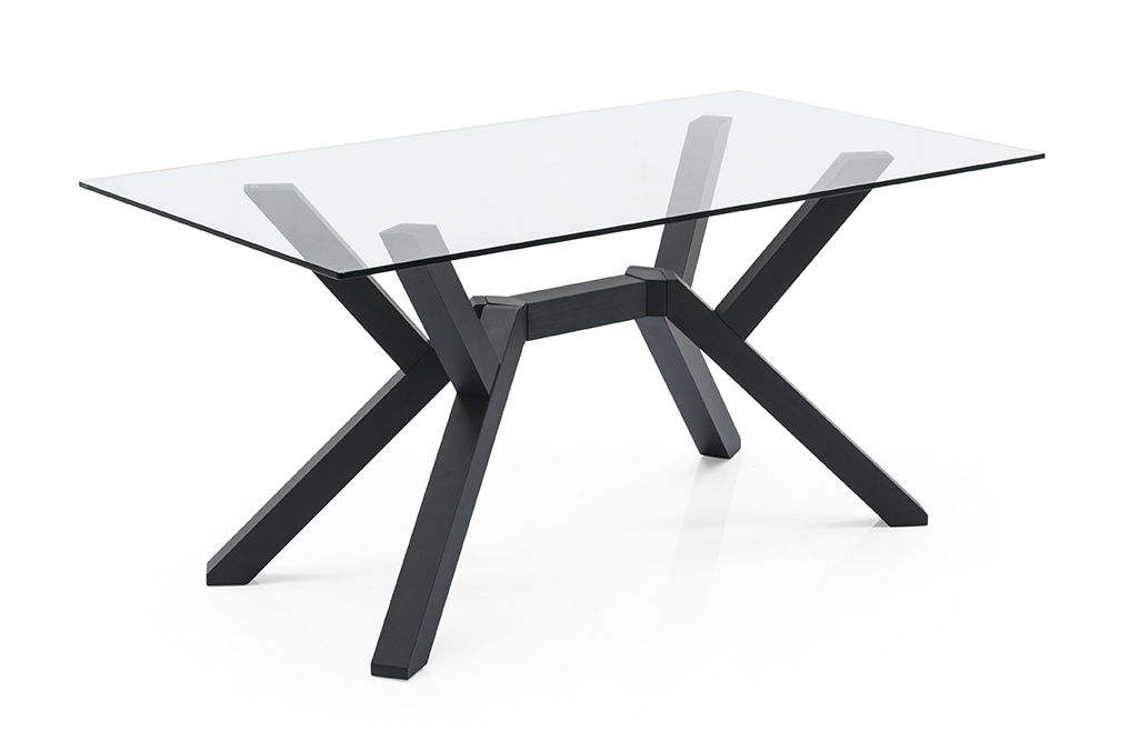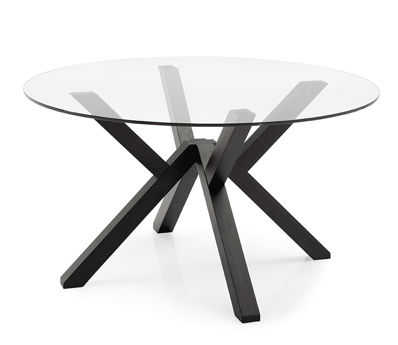MIKADO is a fixed or extendable table with a tempered glass or melamine top and a beech wood frame and legs. The main feature of this table is the design of the pedestal base, with trestles that are joint by a black varnished metal element.