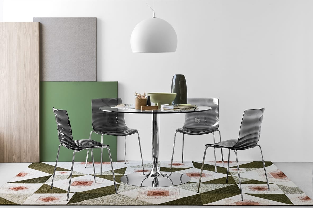 PLANET model table with central pedestal base. Round top. PLANET is a table with a central pedestal base with weighted metal plate, which guarantees maximum stability. The round top is available in tempered glass or in wood. Comfort is ensured for all the diners, even when they are in an odd number! PLANET is a modern and elegant table perfect for the kitchen and the dining rom.