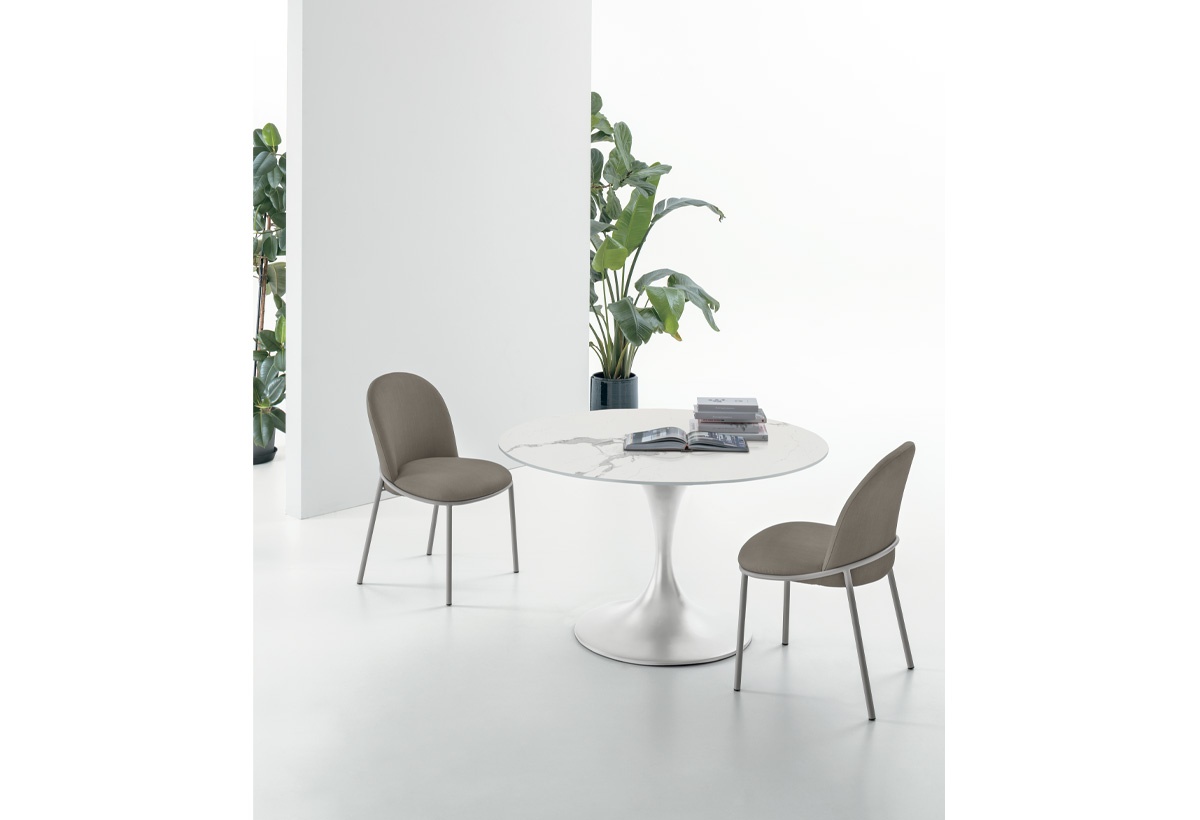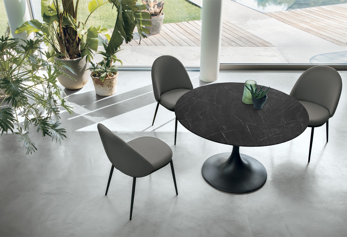 Jazz embodies refined design: a round table that combines essential style with sophisticated details. The sculptural central painted metal base, reminiscent of a trumpet shape, supports a clean-lined, timeless marble-effect top. Available as a fixed table or with a central fold-out leaf, Jazz adapts elegantly to any occasion, accommodating more people without losing the minimalist charm that defines it. Round table with central painted metal base.