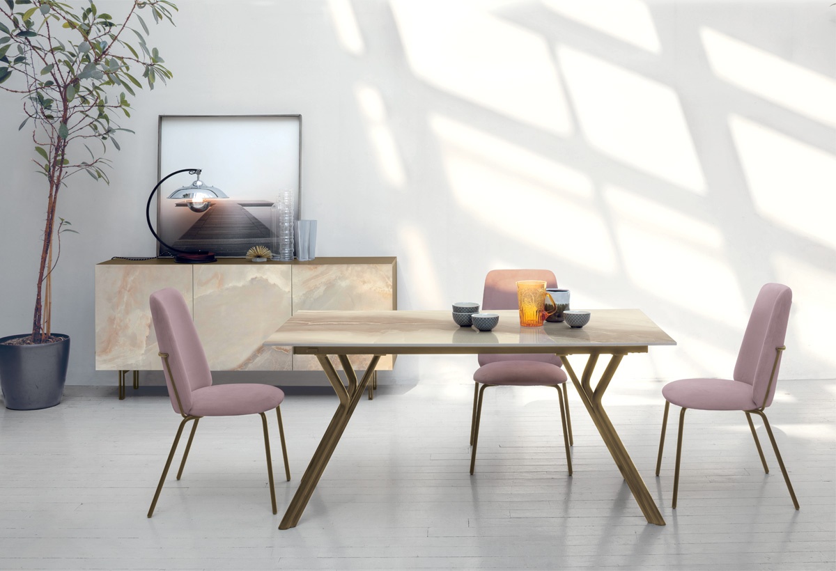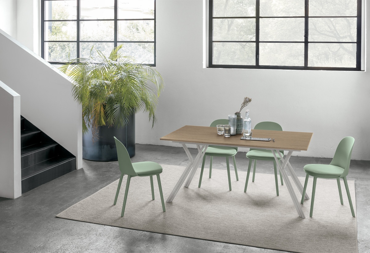 Katana is a rectangular dining table available with top in stoneware, laminate (wood, mortar or marble effect) and glass, also with digital printing, and metal structure. Double extension leaf.