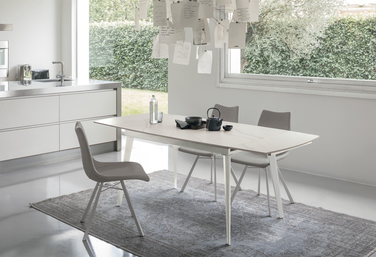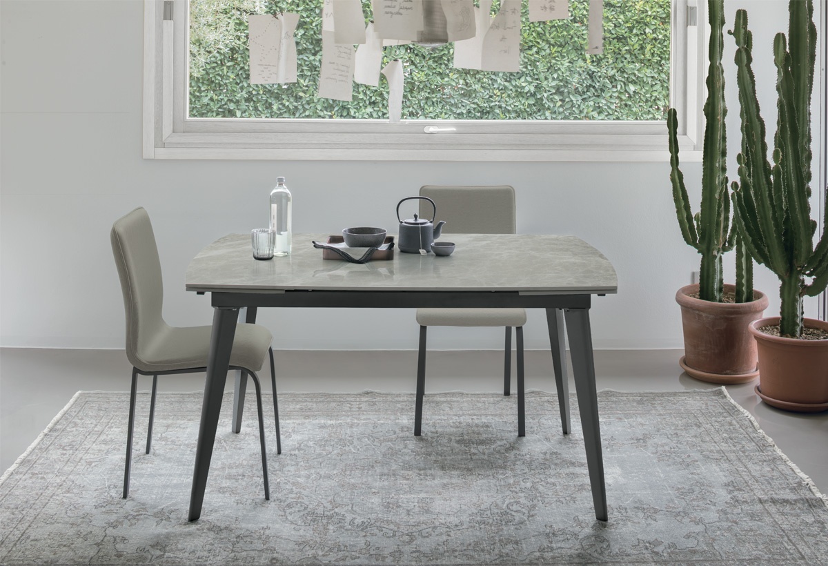 Extendable kitchen table from 140 to 210 cm with metal structure and top in matte or glossy stoneware.